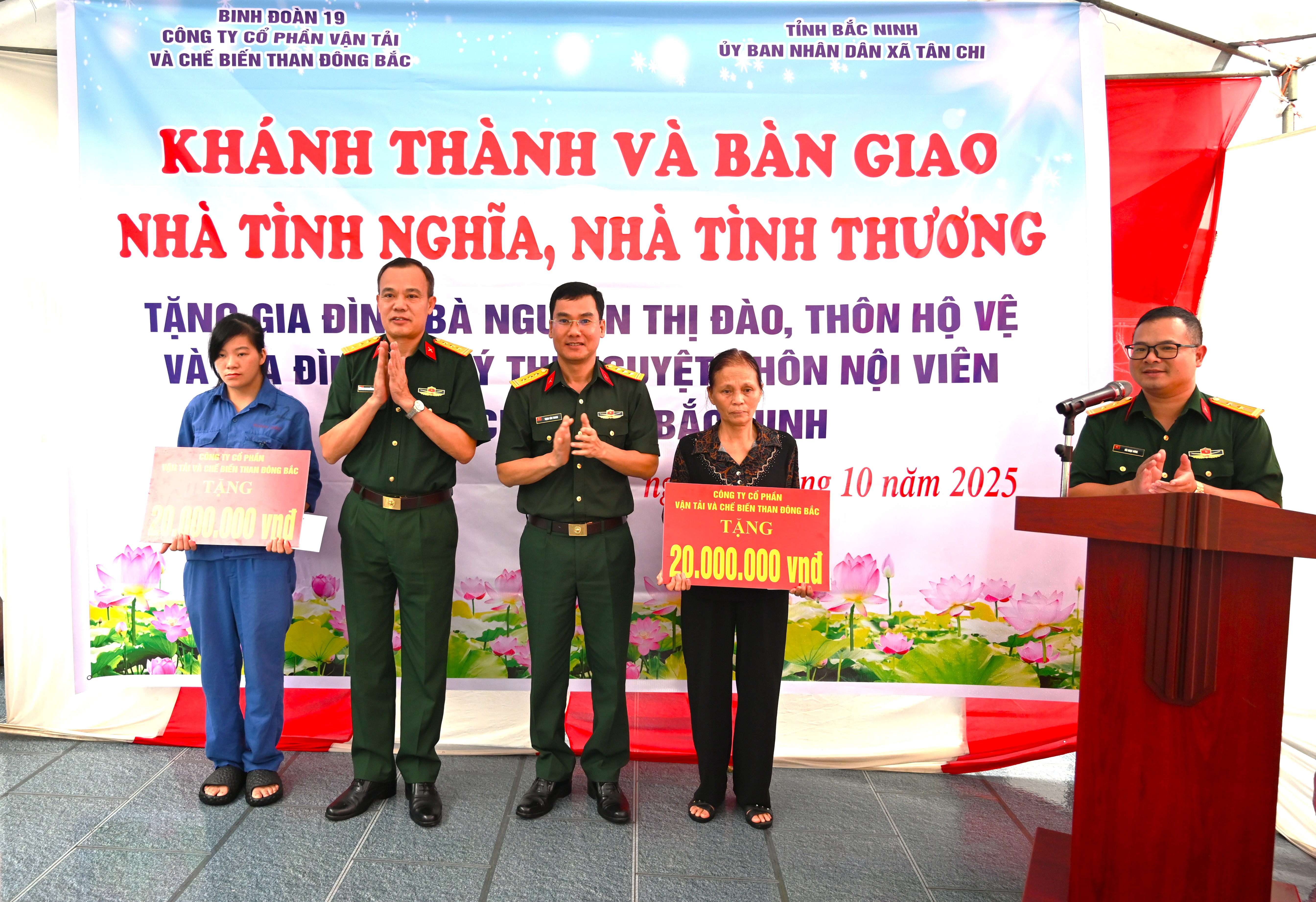 Phát biểu tại buổi khánh thành, bàn giao Nhà tình nghĩa, nhà tình thương, đồng chí Thượng tá Trịnh Văn Thanh Bí thư Đảng ủy, Chủ tịch HĐQT Công ty nhấn mạnh, việc xây dựng nhà tình nghĩa, nhà tình thương hằng năm là một trong những nhiệm vụ quan trọng, thể hiện trách nhiệm của cán bộ, CNVC, lao động trong Binh đoàn 19 nói chung và Công ty cổ phần VT&CB than Đông Bắc nói riêng với cộng đồng, qua đó, phát huy truyền thống tốt đẹp của dân tộc về tinh thần “Tương thân, tương ái”, “Lá lành đùm lá rách”, giúp đỡ, động viên các gia đình có hoàn cảnh khó khăn về nhà ở sớm ổn định cuộc sống, góp phần tăng cường mối quan hệ gắn bó, đoàn kết quân, dân, tô thắm thêm hình ảnh “Bộ đội Cụ Hồ” sáng mãi trong lòng Nhân dân.