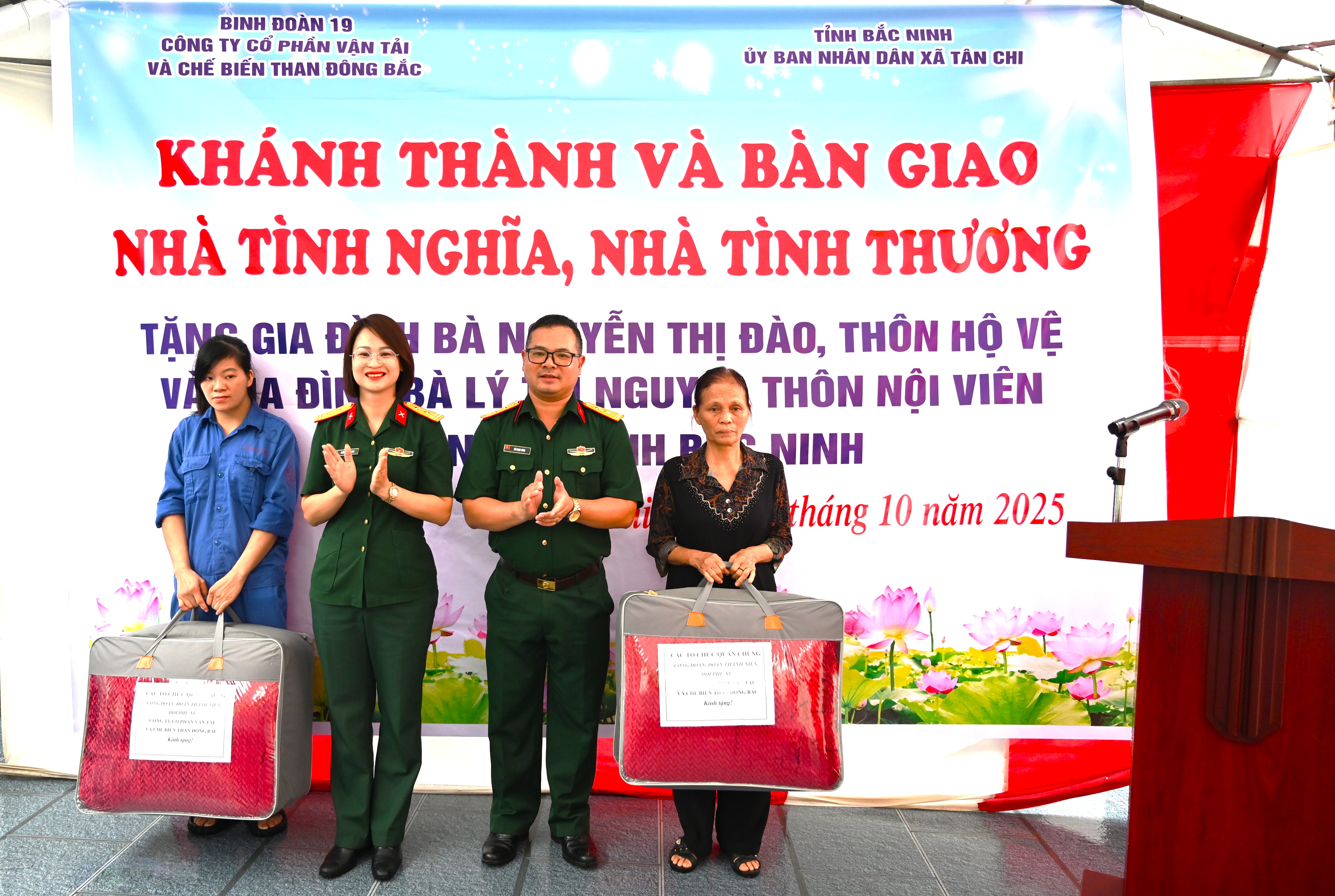 Thực hiện Quyết định số 2891/QĐ-ĐB ngày 10/4/2025 của Tổng Giám đốc Tổng Công ty Đông Bắc về việc trích tiền ủng hộ phong trào thi đua “Quân đội chung sức xây dựng nông thôn mới” của cán bộ, CNVC, lao động trong Tổng Công ty cấp cho các đơn vị sửa chữa, xây dựng nhà tình nghĩa, nhà đồng đội, nhà đại đoàn kết, nhà tình thương, tặng cho các gia đình có hoàn cảnh khó khăn về nhà ở năm 2025. Ngày 15/10/2025, Công ty cổ phần Vận tải và Chế biến than Đông Bắc phối hợp với cấp ủy, chính quyền, các cơ quan, đoàn thể địa phương tổ chức khánh thành và bàn giaonhà tình nghĩa, nhà tình thương cho các hộ gia đình có hoàn cảnh khó khăn về nhà ở tại các tỉnh, Hưng Yên - thành phố Hải Phòng - tỉnh Bắc Ninh.