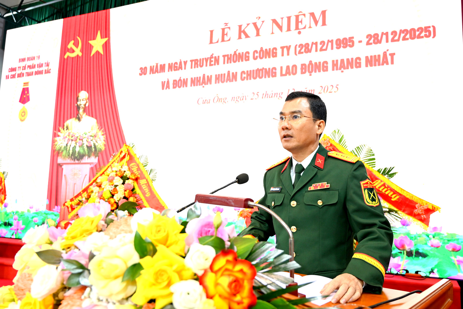 Thừa ủy quyền của Thủ trưởng Bộ Tư lệnh Binh đoàn 19, đồng chí Thượng tá Trịnh Văn Thanh, Bí thư Đảng ủy, Chủ tịch HĐQT Công ty đọc Thư khen của Bộ trưởng Bộ Quốc phòng gửi cán bộ, chiến sĩ, lao động Công ty nhân dịp kỷ niệm 30 năm Ngày truyền thống. Trong Thư khen, đồng chí Bộ trưởng Bộ Quốc phòng đã ghi nhận và biểu dương những thành tích, sự tiến bộ, trưởng thành của Công ty cổ phần VT&CB than Đông Bắc trong 30 năm qua; các thế hệ cán bộ, chiến sĩ, lao động Công ty cổ phần VT&CB than Đông Bắc đã phát huy bản chất tốt đẹp, truyền thống vẻ vang của Quân đội nhân dân Việt Nam anh hùng, đoàn kết, nhanh nhạy, chủ động, sáng tạo, có nhiều giải pháp nâng cao chất lượng quản trị doanh nghiệp, hiệu quả sản xuất, kinh doanh đúng pháp luật, hoàn thành xuất sắc nhiệm vụ quốc phòng, tiếp nhận, sàng tuyển, chế biến, tiêu thụ than và tham gia chuỗi dịch vụ vận tải mang lại giá trị kinh tế cao, bảo vệ môi trường, thu nhập ổn định cho người lao động; tích cực tham gia phòng, chống khắc phục hậu quả thiên tai, xây dựng nông thôn mới, đền ơn, đáp nghĩa, phòng, chống dịch bệnh trên địa bàn, góp phần tích cực vào sự nghiệp xây dựng và bảo vệ Tổ quốc Việt Nam Xã Hội Chủ Nghĩa.