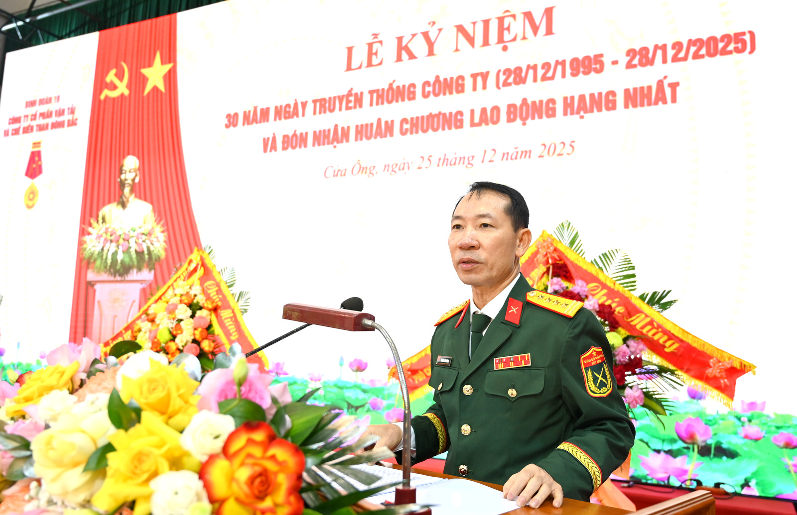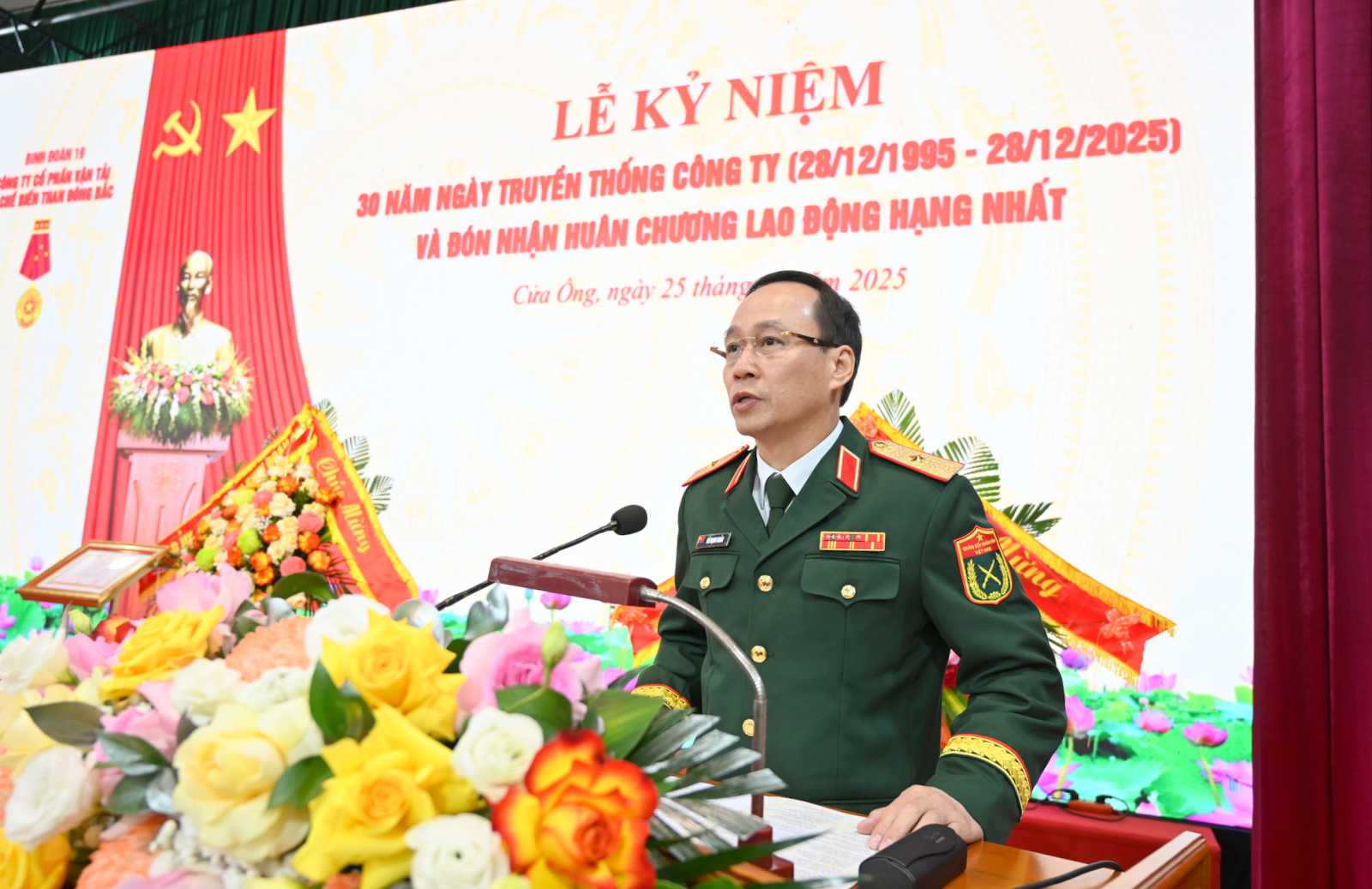 Phát biểu chỉ đạo tại buổi Lễ, đồng chí Thiếu tướng Đỗ Mạnh Khảm, Phó Bí thư Đảng ủy, Tư lệnh Binh đoàn 19 đã ghi nhận, biểu dương và chúc mừng những thành tích xuất sắc, tiêu biểu mà Công ty cổ phần VT&CB than Đông Bắc đã đạt được trong suốt 30 năm qua. Đồng chí yêu cầu Công ty tiếp tục quán triệt sâu sắc các chủ trương, đường lối của Đảng, chính sách pháp luật của Nhà nước và nhiệm vụ quân sự, quốc phòng; phát huy truyền thống đoàn kết, chủ động đổi mới, nâng cao hiệu quả sản xuất kinh doanh gắn với thực hiện nhiệm vụ quốc phòng; xây dựng Đảng bộ trong sạch, vững mạnh, đơn vị vững mạnh toàn diện “Mẫu mực, tiêu biểu”, đáp ứng yêu cầu nhiệm vụ trong tình hình mới.